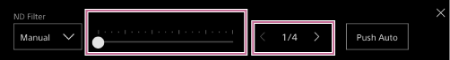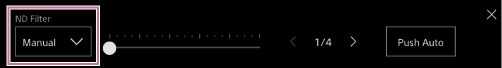 - يمكنك أيضًا الضغط على الزر [Push Auto] على لوحة تعديل ND Filter لتعيين مرشح ND التلقائي على On أثناء الضغط على الزر.