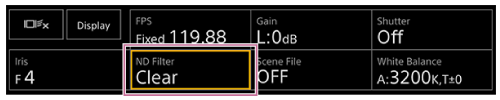 - عندما ينتقل مرشح ND إلى [Clear] أو ينتقل منه أثناء التصوير، يتم عرض إطار مرشح ND على الصورة ويصدُر صوت التشغيل.