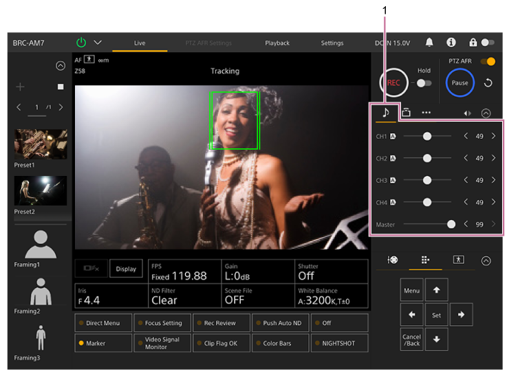 يمكنك ضبط مستوى الصوت الذي سيتم تسجيله بواسطة الوحدة على شاشة التشغيل المباشر لتطبيق الويب. قم بتهيئة الإعدادات مسبقًا باستخدام قائمة الكاميرا أو قائمة الويب.