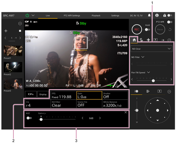 يمكنك ضبط السطوع عن طريق ضبط القزحية، وكسب الإشارة، والغالق، وعن طريق ضبط مستوى الضوء باستخدام مرشحات ND في لوحات التحكم التالية لشاشة التشغيل المباشر في تطبيق الويب. يمكنك أيضًا ضبط السطوع تلقائيًا.