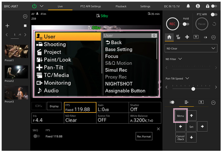اضغط على زر [Menu] في لوحة التحكم في GUI على شاشة التشغيل المباشر أو شاشة إعادة التشغيل لعرض قائمة الكاميرا في لوحة صورة الكاميرا.