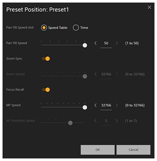حدد [Pan-Tilt Speed Unit] – [Time] واضبط عدد مرات الانتقال (التدوير-الإمالة/التكبير) التي تريد تغييرها باستخدام شريط التمرير أو أدخل القيم مباشرة واضغط على زر [OK].
