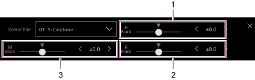 يمكنك تخصيص المظهر بناءً على المظهر الأساسي باستخدام شريط التمرير [Master Black]، و[R Black]، و[B Black] في لوحة تعديل Scene File في لوحة التهيئة الأساسية للكاميرا و[Paint/Look] – [Matrix] وبنود الإعداد الأخرى في قائمة الكاميرا.