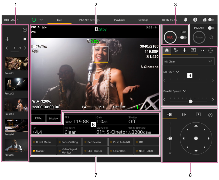 الرقم المعروض على الشاشة الوصف 2-1 مؤشر وضع التركيز البؤري راجع «مؤشر وضع التركيز البؤري» في «عرض شاشة الكاميرا». 2-2 وضع التسجيل، فتحة A/B، مؤشر حالة التشغيل راجع «وضع التسجيل، فتحة A/B، مؤشر حالة التشغيل» في «عرض شاشة الكاميرا». 2-3 مؤشر حالة البث تظهر أثناء البث (عند تعيين [Stream Setting] على [RTMP] أو [SRT-Caller] فقط). 2-4 مؤشر سعة الوسط المتبقي راجع «مؤشر سعة الوسط المتبقي» في «عرض شاشة الكاميرا». 2-5 مؤشر موضع الزوم راجع «مؤشر موضع الزوم» في «عرض شاشة الكاميرا». 2-6 مؤشر حالة التأطير التلقائي PTZ يُعرض عند تمكين التأطير التلقائي PTZ. 2-7 مؤشر وضع AE/مستوى AE راجع «مؤشر وضع AE/مستوى AE» في «عرض شاشة الكاميرا». زر [Display]