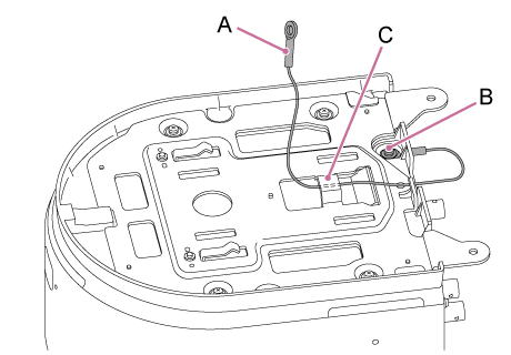 قم بتوجيه الحبل السلكي الواقي من السقوط عبر الحلقة المعدنية للحبل السلكي لذراع التثبيت بالسقف (A) وقم بتركيبه بإحكام في الوحدة باستخدام البرغي المرفق (8×M4).