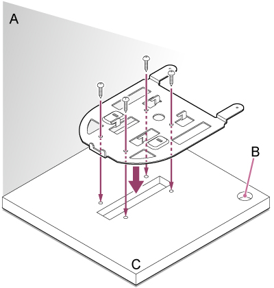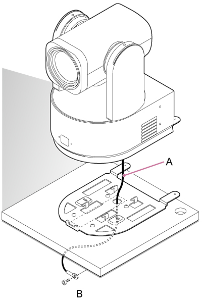 ركّب ذراع التثبيت بالسقف (B) بالسطح، مثل رف يتم تثبيت الوحدة به.
