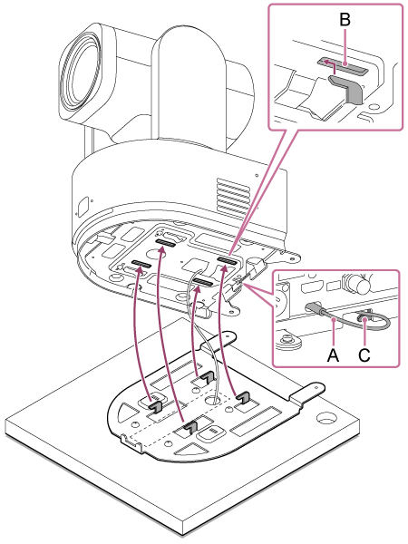 عقّف الحبل السلكي الواقي من السقوط حول نتوء الحبل السلكي لذراع التثبيت بالسقف (A)، وادفع الوحدة بالاتجاه الموضح في الرسم بمسافة 10 مم تقريبًا لتثبيتها في مكانها مؤقتًا.