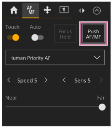 عندما تكون في وضع التركيز البؤري اليدوي، يمكنك ضبط التركيز البؤري مؤقتًا باستخدام التركيز البؤري التلقائي بالضغط على زر [Push AF/MF] للتركيز تلقائيًا أثناء الضغط على الزر.