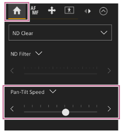 يمكنك تغيير سرعة تشغيل التدوير/الإمالة باستخدام شريط التمرير [Pan-Tilt Speed] في لوحة التحكم في الكاميرا عن طريق تشغيل عصا التحكم في لوحة التحكم في التأطير.