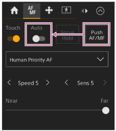 اضغط على الزر [Push AF/MF] عند الوجود في وضع التركيز البؤري التلقائي لإجراء التركيز البؤري يدويًا أثناء الضغط على الزر. يعود التركيز البؤري إلى وضع التركيز البؤري التلقائي عند تحرير الزر.