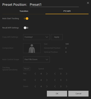 - Among the advanced settings for a preset position, the PTZ auto framing items are disabled in “Ball Sports (Basketball)” mode.