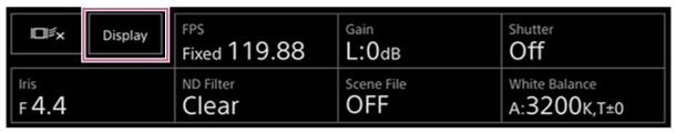 N.º Pantalla Descripción 2-1 Indicador de modo de enfoque Consulte “Indicador de modo de enfoque” en “Visualización de la pantalla de la cámara”. 2-2 Modo de grabación, ranura A/B, indicador de estado operativo Consulte “Modo de grabación, ranura A/B, indicador de estado operativo” en “Visualización de la pantalla de la cámara”. 2-3 Indicador de estado de la transmisión Se muestra durante la transmisión (solo cuando la opción [Stream Setting] está definida en [RTMP] o [SRT-Caller]). 2-4 Indicador de capacidad restante de los soportes Consulte “Indicador de capacidad restante de los soportes” en “Visualización de la pantalla de la cámara”. 2-5 Indicador de posición del zoom Consulte “Indicador de posición del zoom” en “Visualización de la pantalla de la cámara”. 2-6 Indicador de estado del encuadre automático PTZ Se muestra cuando el encuadre automático PTZ está activado. 2-7 Indicador de modo AE/nivel AE Consulte “Indicador de modo AE/nivel AE” en “Visualización de la pantalla de la cámara”. Botón [Display]
