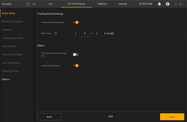 - [PTZ AFR On when Power On]: Impostare sulla posizione di attivazione per iniziare con l’inquadratura automatica PTZ abilitata all’accensione dell’unità.