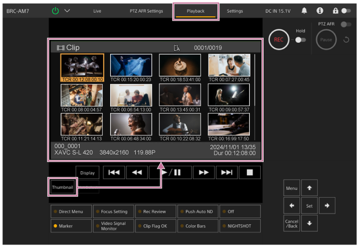Quando si preme il pulsante [Thumbnail] nella schermata delle operazioni di riproduzione oppure il pulsante THUMBNAIL del telecomando a infrarossi, i clip registrati sulla scheda di memoria vengono visualizzati nel pannello dell’immagine della telecamera. Questa visualizzazione nel pannello dell’immagine della telecamera è denominata schermata delle miniature.