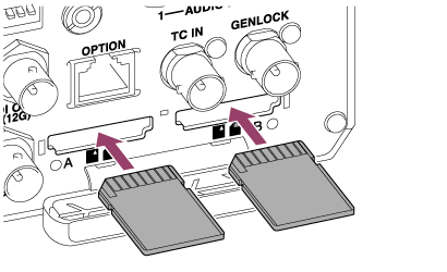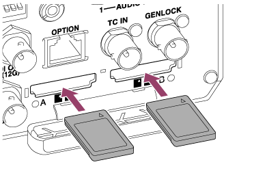 - 录制到CFexpress Type A/SD卡插槽A和B中插入的存储卡时,在两个插槽中插入根据录制格式推荐的存储卡。