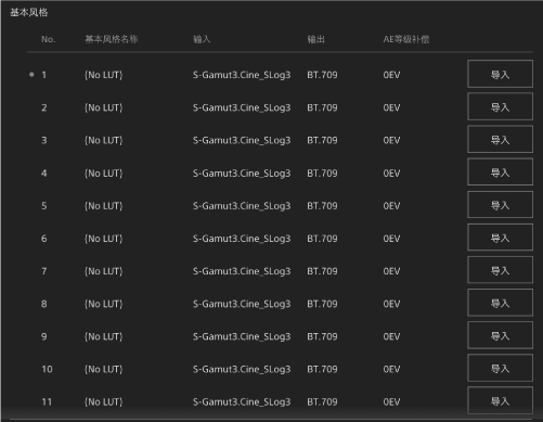 导入后,为摄像机菜单中的[输入]、[输出]和[AE等级补偿]设置合适的值。有关详细信息,请参阅“导入所需基本风格”。