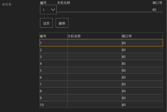 | [删除] | – | – | 选择要删除的例外,然后按此按钮从例外表中删除已注册的例外。 |