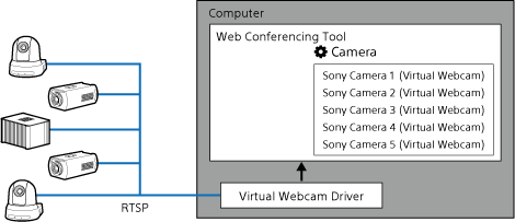 计算机已将本软件中注册的摄像头识别为虚拟USB设备“Sony Camera 1 (Virtual Webcam)”至“Sony Camera 5 (Virtual Webcam)”。在注册摄像头后,即可使用摄像头而无需再次注册。