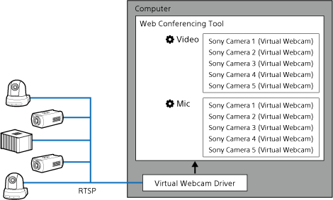 计算机已将本软件中注册的摄像头识别为虚拟USB设备“Sony Camera 1 (Virtual Webcam)”至“Sony Camera 5 (Virtual Webcam)”。在注册摄像头后,即可使用摄像头而无需再次注册。