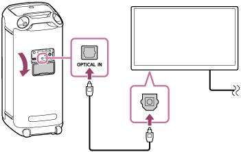 Plasser høyttaleren vertikalt og koble deretter en optisk ut-kontakt på TV-en din sammen med OPTICAL IN-kontakten (optisk digital lydinngang) på høyttaleren sammen med den medfølgende optiske digitale kabelen.