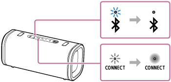 (BLUETOOTH)-indikatoren og CONNECT-indikatoren på højttaleren blinker langsomt. Inden for ca. 5 sekunder hører du notifikationslyden fra højttaleren igen, og CONNECT-indikatoren holder op med at blinke og forbliver tændt. Mens der etableres en forbindelse til festtilslutningsfunktionen, skifter aktiviteten af