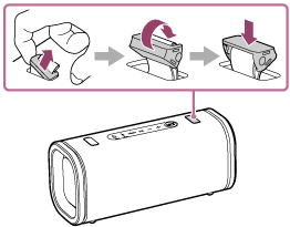 Akassza bele a hangszóró jobb oldali tárolókupakjának fülébe az ujját, és húzza fel. Forgassa el a tárolókupakot az óramutató járásával megegyezően az ábrának megfelelően, és nyomja le.