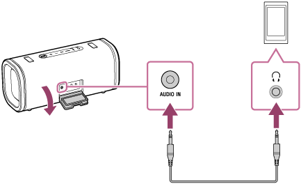 Podłącz urządzenie do gniazda AUDIO IN na głośniku za pomocą dostępnego w sprzedaży przewodu audio.