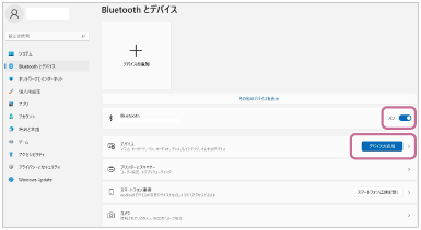 「Bluetooth」スイッチをクリックしてBLUETOOTH機能をオンにし、[デバイスの追加]をクリックする。