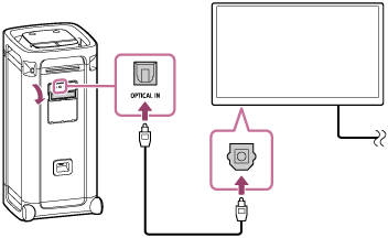 เชื่อมต่อช่องสัญญาณเสียงออกด้วยสายออปติคัลที่ทีวีของคุณเข้ากับขั้วต่อ OPTICAL IN (ช่องสัญญาณเสียงเข้าโดยใช้สายดิจิทัลออปติคัล) ที่ลำโพง โดยใช้สายดิจิทัลออปติคัลที่ให้มา