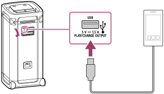وصّل جهاز USB، مثل هاتف ذكي أو iPhone، بمنفذ PLAY/CHARGE OUTPUT (USB) الموجود بمُكبِّر الصوت بواسطة كابل USB (متوفر بالأسواق).
