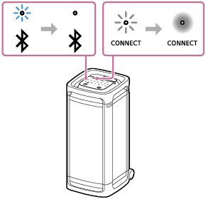 (BLUETOOTH) a indikátor CONNECT na reproduktoru budou pomalu blikat. Za zhruba 5 sekund uslyšíte z reproduktoru zvukový signál znovu a indikátor CONNECT na reproduktoru přestane blikat a zůstane svítit. Při sestavování připojení pro funkci Párty-připojení se stav indikátoru