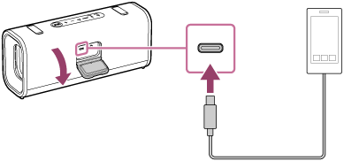 Ligue um dispositivo USB, como um smartphone ou um iPhone, à porta DC IN/OUT com um cabo USB disponível no mercado. A porta DC IN/OUT está localizada atrás da tampa na parte de trás do altifalante.