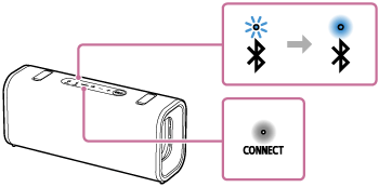 Du hör aviseringsljudet från högtalaren. Därefter blinkar BLUETOOTH-indikatorn och CONNECT -indikatorn på högtalaren långsamt. Om ca 5 sekunder hörs aviseringsljudet från högtalaren igen och indikatorn CONNECT på högtalaren slutar blinka och fortsätter att lysa. Medan en anslutning för Party Connect-funktionen upprättas ändras BLUETOOTH-indikatorn på högtalaren från att lysa till att blinka.