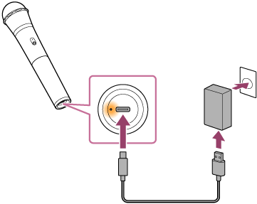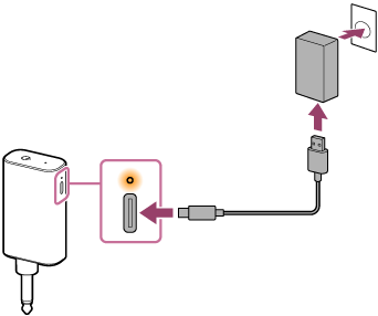 Conectați microfonul sau receptorul la o priză de curent utilizând un adaptor USB AC disponibil în comerț. Dacă bateria reîncărcabilă încorporată este complet încărcată, indicatorul de încărcare se va aprinde în portocaliu și se va stinge după aproximativ 1 minut.