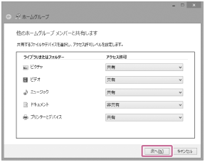 - [ミュージック]が[共有]になっていることを確認して、[次へ]を選ぶ。