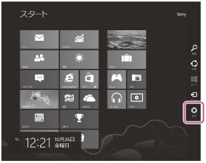 - スタート画面でマウスポインターを画面の右上隅(または右下隅)へ合わせてチャームを表示し、[設定]を選ぶ。タッチパネルの場合は、スタート画面の右端からスワイプしてチャームを表示し、[設定]を選ぶ。