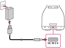 Sluit het ene uiteinde van een USB Type-C®-kabel aan op de DC IN 5V-aansluiting van de luidspreker, het andere uiteinde op een USB-netstroomadapter (in de handel verkrijgbaar) en sluit vervolgens de USB-netstroomadapter aan op een stopcontact.