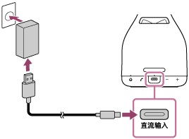 将USB Type-C®电缆的一端连接到扬声器的直流输⼊(DC IN)5V端口,另一端连接到USB交流电源适配器(市售),然后将USB交流电源适配器连接到交流电源插座上。