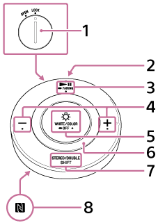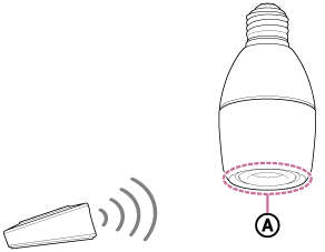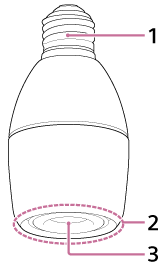 押すたびに、電球スピーカーの照明を点灯/カラーモード/消灯と切り替えます。長く押すと消灯し、BLUETOOTH接続を切断します。(長く押して消灯した場合は、再度点灯するときに、電球スピーカーが操作を受け付けるまでに時間がかかります。)