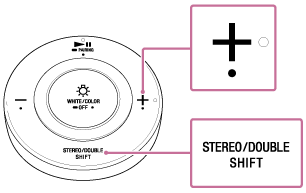 - リモコンを2台の電球スピーカーに向けて、STEREO/DOUBLE(モード切替)/SHIFT(シフト)ボタンを押しながら、音量+ボタンを約1秒間押す。