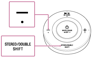 - リモコンを2台の電球スピーカーに向けて、STEREO/DOUBLE(モード切替)/SHIFT(シフト)ボタンを押しながら、音量-ボタンを約1秒間押す。