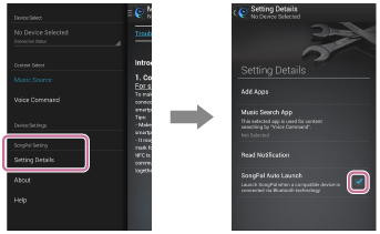 - 取消勾选[SongPal自动启动]后,当通过BLUETOOTH将移动设备连接到音频设备时,SongPal应用程序不会自动启动。若要自动启动SongPal应用程序,请重新勾选[SongPal自动启动]。