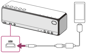 Du kan tilslutte en Walkman, der er kompatibel med lydformater i høj opløsning, til højttaleren med det medfølgende micro-USB-kabel og et valgfrit WM-PORT-USB-adapterkabel til lyd i høj opløsning.*
