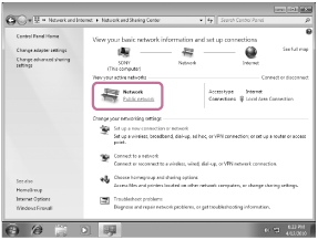 Kun asetus on tehty, vahvista [Network and Sharing Center] -näytössä, että kohdassa [View your active networks] valituksi kohteeksi on vaihtunut [Home network] tai [Work network].