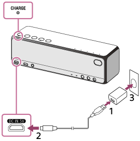 USB AC 어댑터를 통해 스피커를 AC 콘센트에 연결하면 충전이 시작되고 CHARGE 표시등이 주황색으로 점등됩니다. 약 5시간*1 후에 충전이 완료되고 표시등이 꺼집니다.