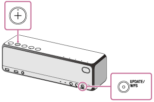 - 当扬声器连接到Wi-Fi网络(LINK指示灯以橙色点亮)时,开启扬声器,然后按住+(音量)按钮和UPDATE/WPS按钮。