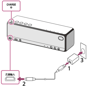 当通过USB交流电源适配器将扬声器连接至交流电源插座时,将开始充电,并且CHARGE指示灯将以橙色点亮。充电将在约5小时*1后完成,然后指示灯熄灭。
