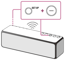 - 当扬声器连接到Wi-Fi网络(LINK指示灯以橙色点亮)时,开启扬声器,然后按住-(音量)按钮和SET UP按钮。