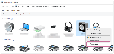 Klik met de rechter muisknop op [SRS-NB10] onder [Devices] en selecteer vervolgens [Properties] van het contextmenu*.