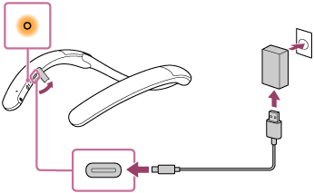 Se a bateria incorporada estiver totalmente carregada quando ligar a coluna de pescoço a uma tomada de CA com um transformador de CA USB disponível no mercado, o indicador acende-se na cor laranja e apaga-se alguns minutos depois.